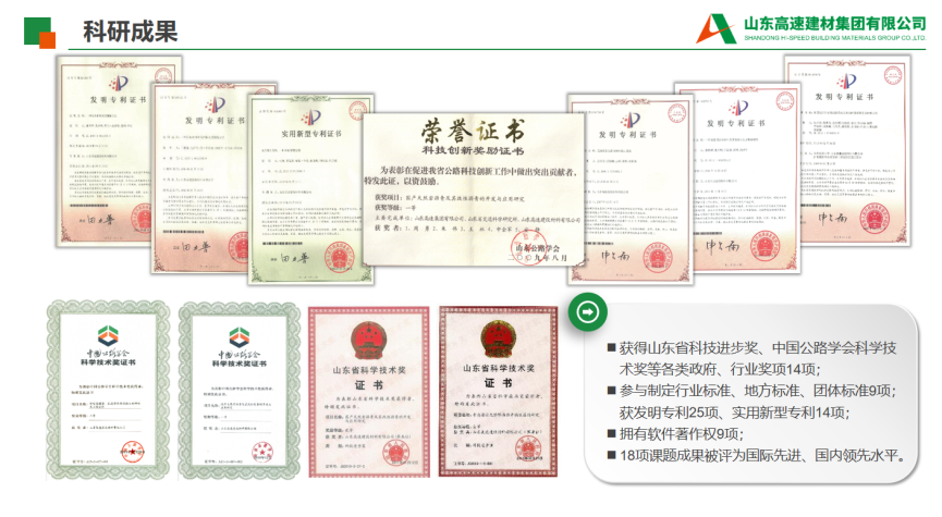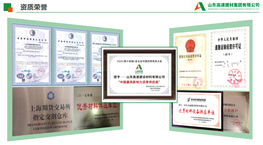 7.公司简介:公司简介:华体会平台-华体会(中国) 是由山东高速集团、美国海瑞集团共同出资组建的中外合资企业,注册资本3.61亿元人民币,下辖7家权属单位。 公司主要从事各类道路沥青的研产、储运、销售以及公路、桥梁等防水材料的生产施工,公路、港口、铁路、房建等建设材料的经营业务等。沥青公司坚持以创新为追求,以市场为导向,以客户为核心,以价值为考量,致力于打造具有国际竞争力的世界一流建材综合服务商。作为山东省道路材料经营的龙头企业,沥青公司在沥青市场占有率居全国同行业第一位,建有改性沥青生产线15条,拥有50万吨以上的沥青罐容、50万吨以上的钢材库容、日运力5000吨专业沥青车队及山东2家上期所石油沥青交割社会库,参与建设了华北、华东、华中、西南、西北等5个区域26余个省市的高速公路和市政道路工程;参与了阿尔及利亚东西高速、埃塞俄比亚AA高速及朝鲜平壤重点公路等项目的材料供应,为国内外公路、铁路建设做出了重要贡献。公司将技术创新作为可持续发展的动力,与中国石油大学、山东交通学院、美国海瑞集团等开展了有效深入合作,科研创新软实力进一步增强。2008年至今,先后承担20余项交通运输部、省交通运输厅等政府部门立项科技项目,获得山东省科技进步奖、中国公路学会科学技术奖、山东公路学会科学创新奖、交通科学技术奖等政府、行业奖项共16项,参与制定行业标准、地方标准、团体标准共9项、在制定地方标准3项,授权发明专利27项、实用新型专利18项、在申请发明专利14项,拥有软件著作权9项,省级工法1项,鉴定科技成果18项,发表学术论文18篇,获批一个集团级科研平台--沥青新材料研发平台,科技创新成效初显。